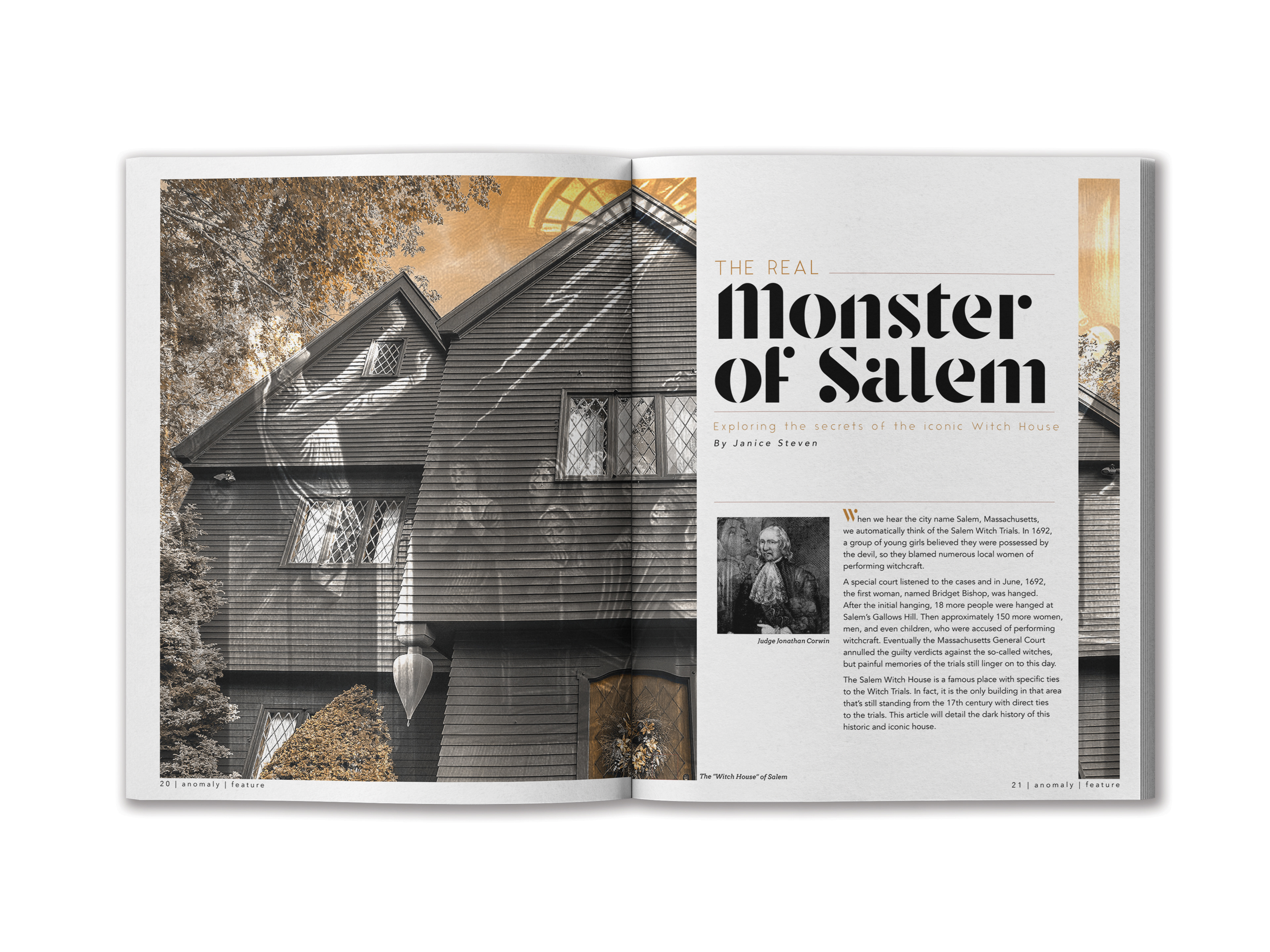 “Anomaly” is a travel magazine based around the Salem Witch Trials in Massachusetts. It features the truths about the trials and also shows “witchy” things to do in Salem. I incorporated illustrations from the trials to show how people were convinced that these women were actually witches. The design style uses bold type and dramatic colors. The magazine as a whole would appeal more to a younger audience.